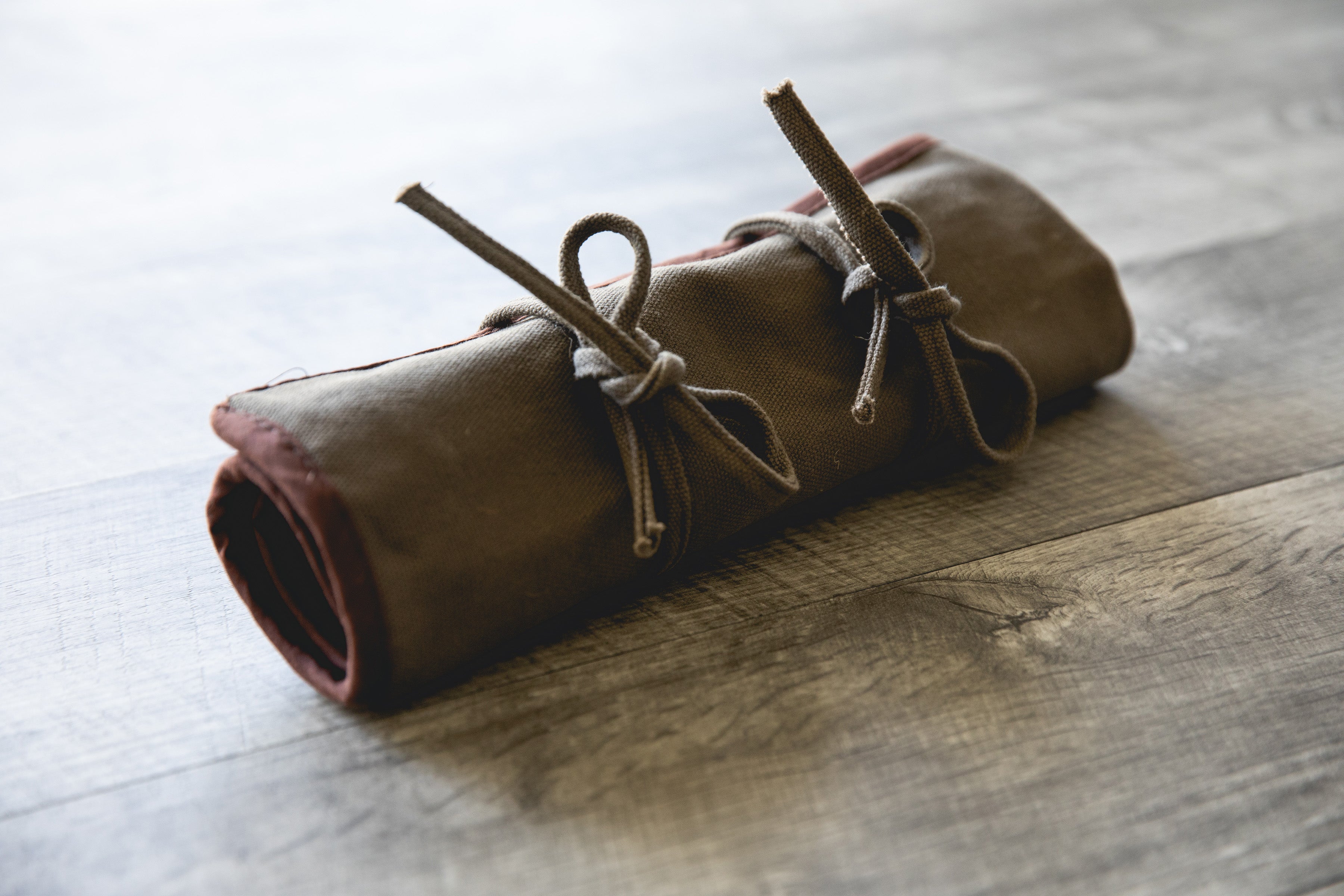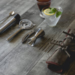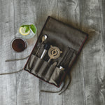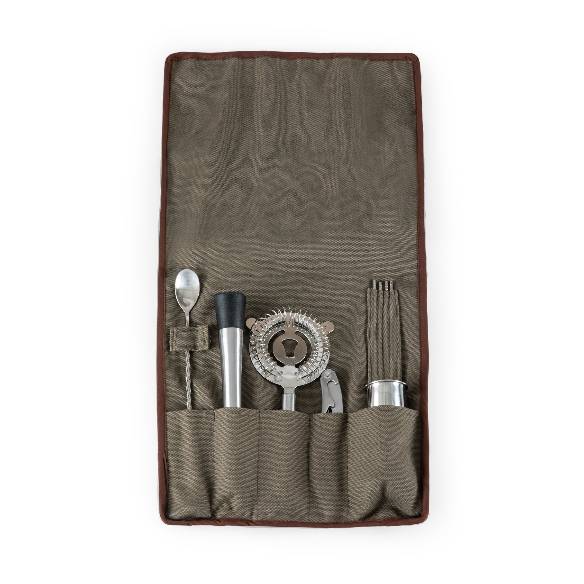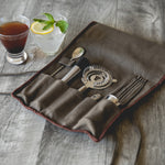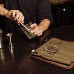 Perfect for the roaming mixologist, the 10-piece Bar Tool Roll Up Kit is a highly-portable and packable waxed-canvas roll-up bar tool set.