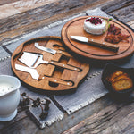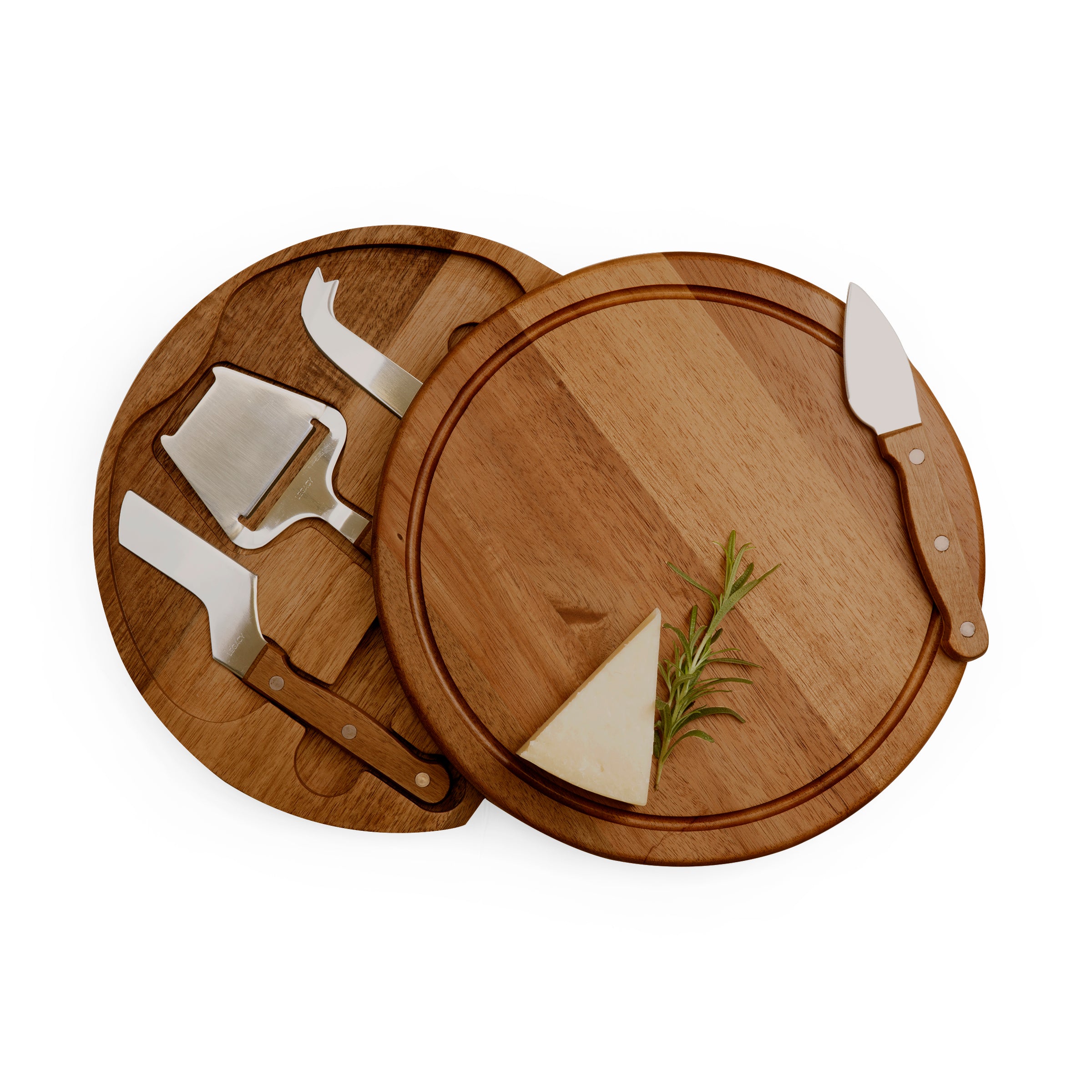 - Circular cheese/cutting board and four full-tang stainless steel cheese tools with wooden handles