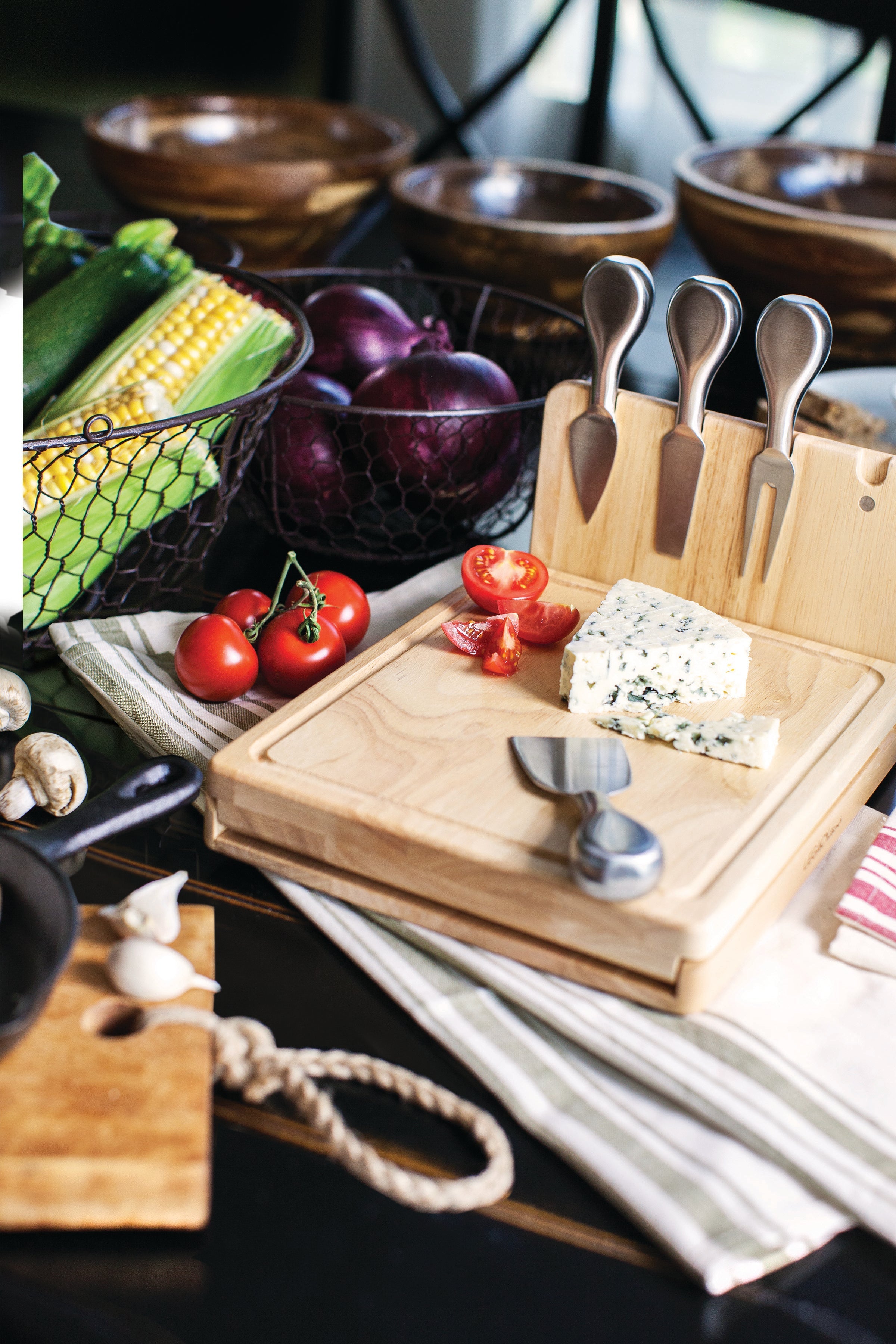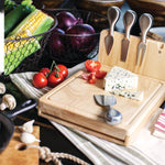 The Asiago Cheese Board and Knife Set is equally suited to picnic cheese spreads and dinner party charcuterie boards. This split-level cheese board set folds open to reveal a generously sized wood cutting board and four fully-contained brushed stainless steel cheese tools.