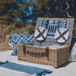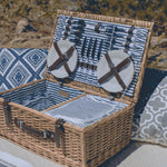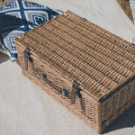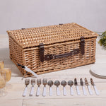 The Belmont Picnic Basket for 4 is a deluxe wicker English picnic basket set loaded with full wine and cheese picnic service for four and plenty of romantic vintage charm.