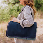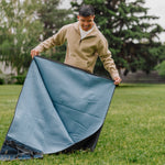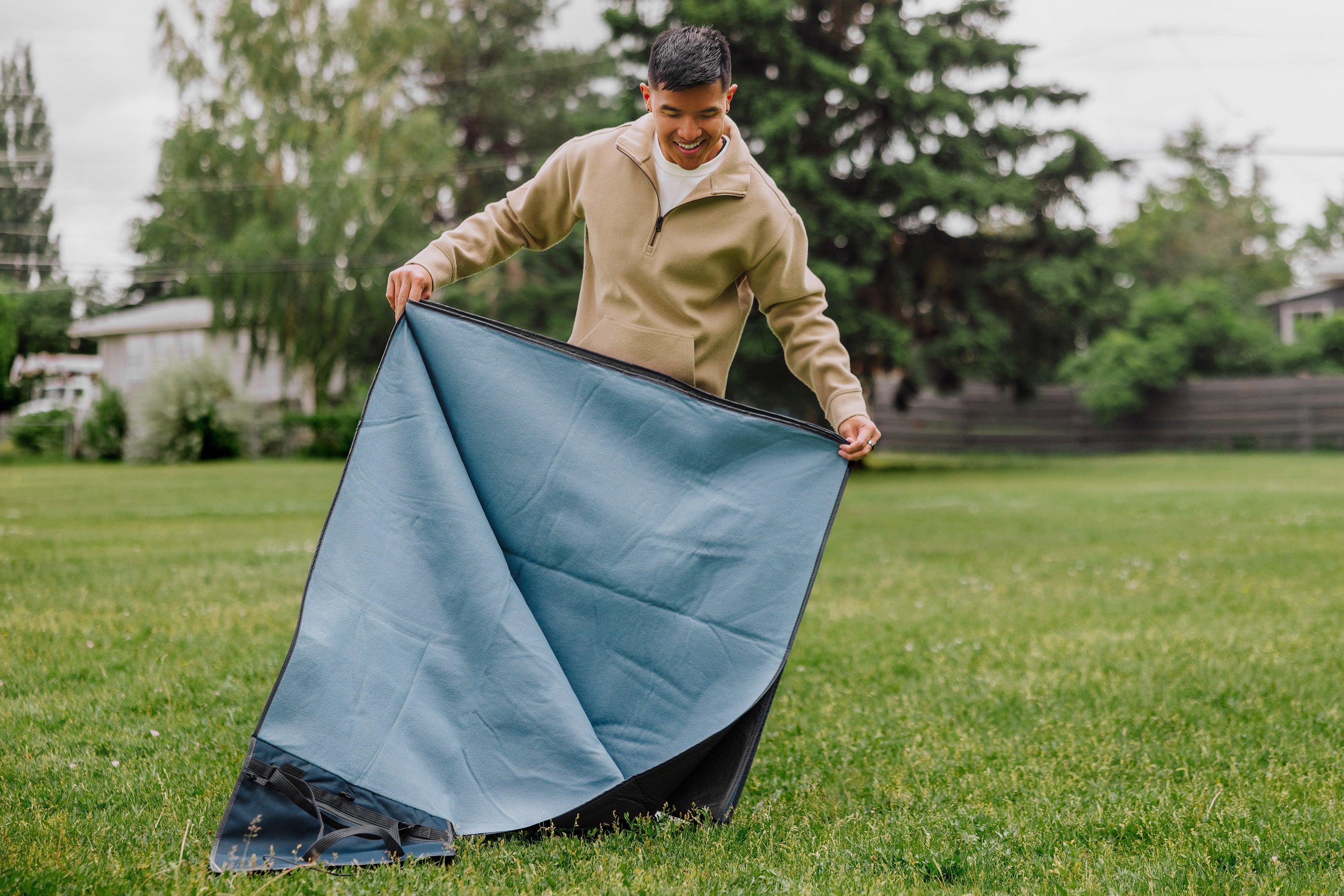 The Blanket Tote XL Outdoor Picnic Blanket is an extra-large portable camping blanket with soft fleece topside and water-resistant underside that packs into a compact carry tote.