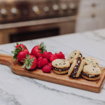 I assuming love this charcuterie paddle board! It is the perfect size for a small gathering and the quality of this board is impeccable! Easy to wash and clean abs it makes a cute display on your counter as well. I highly recommend this board for small gatherings!