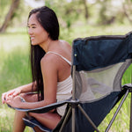 The Campsite Camping Chair is a highly-portable outdoor folding beach chair that folds into a drawstring carrying bag with a shoulder strap.