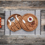 - Circular cheese/cutting board and four full-tang stainless steel cheese tools with wooden handles