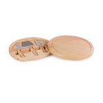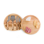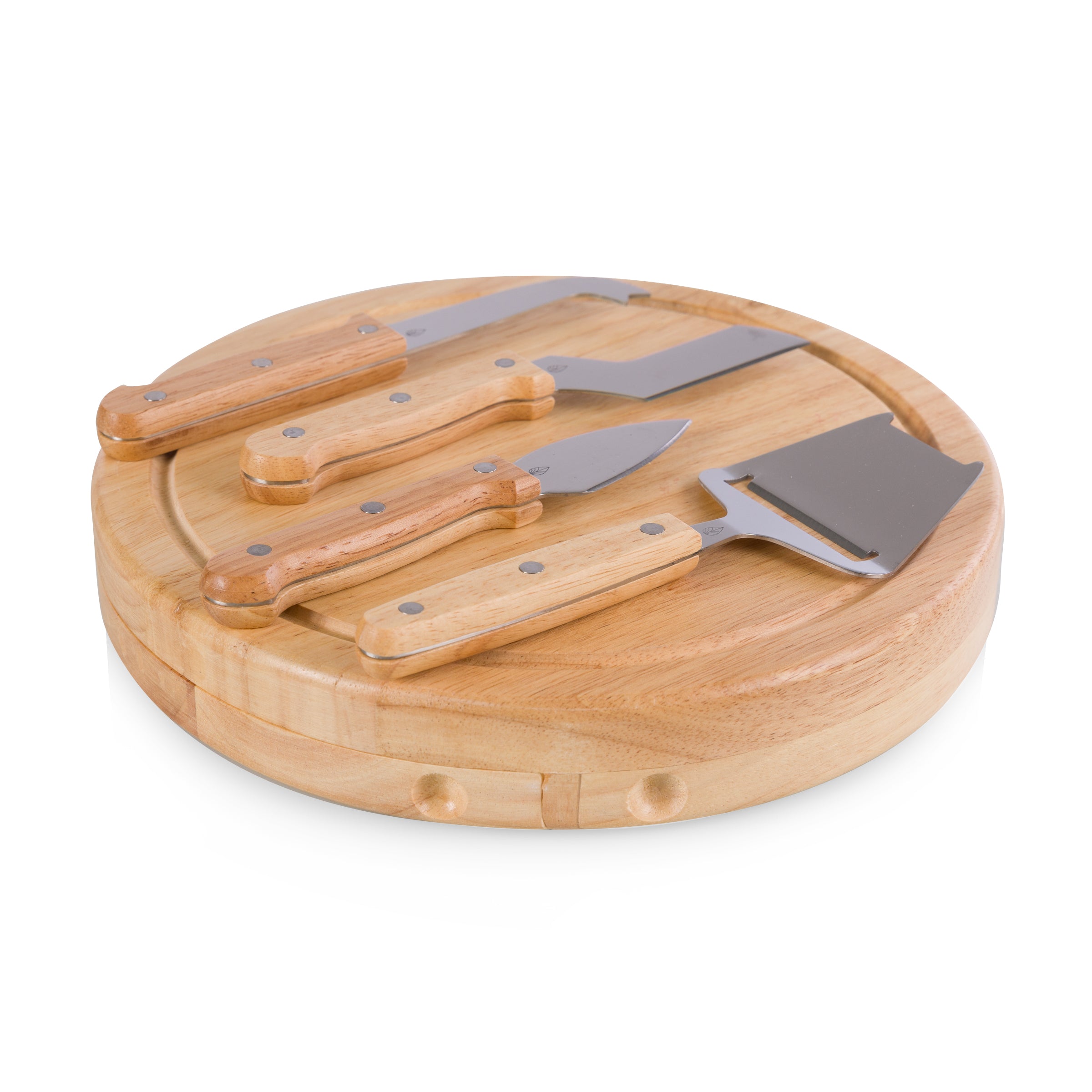 - The board swivels open to reveal four stainless steel cheese tools with parawood handles