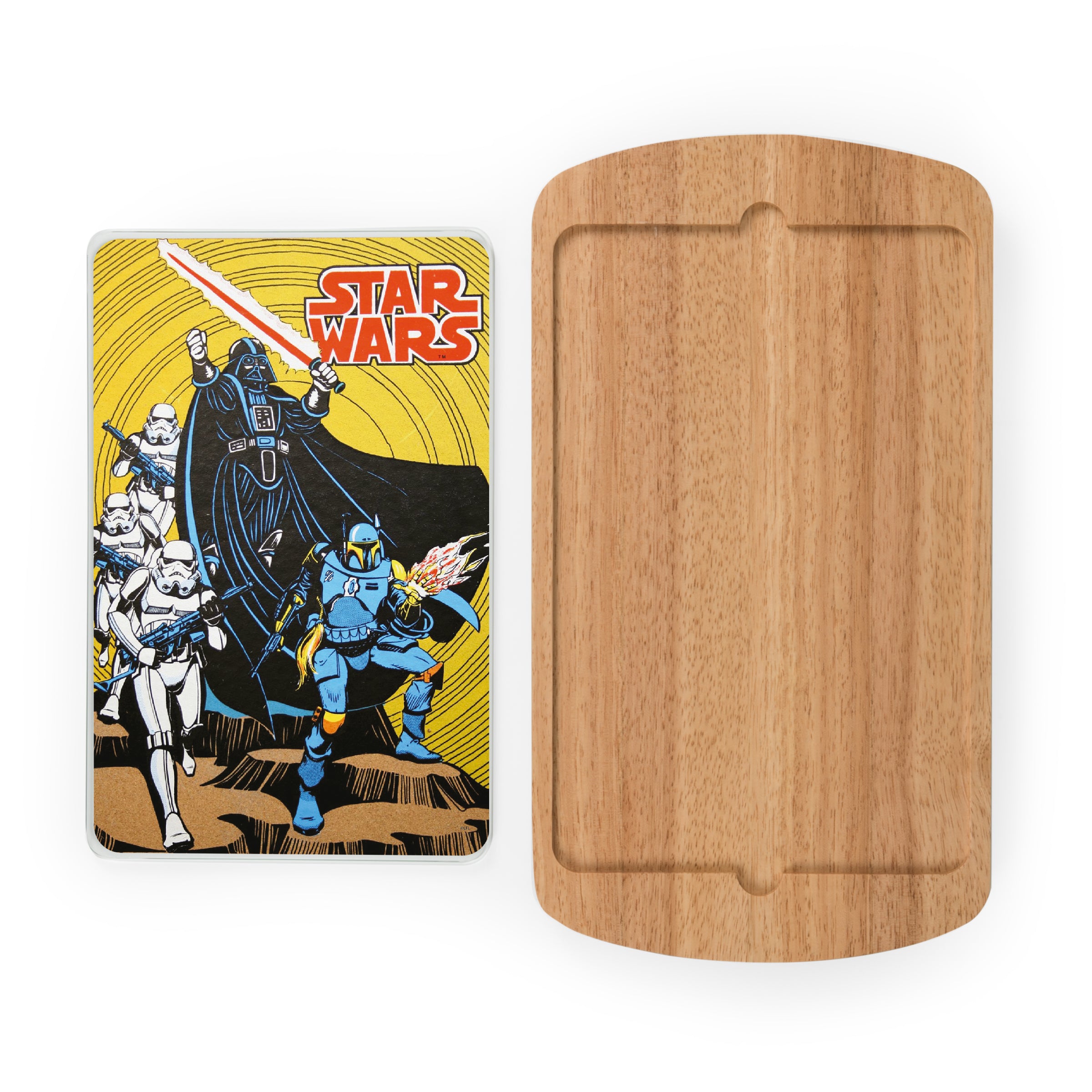 Bright and graphic, yet refined, the Star Wars Darth Vader Billboard Glass Top Serving Tray is a parawood cutting board with knife and a colorful comic-style removable Star Wars glass plate top.