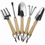 - 5 Steel gardening tools (Garden Fork, Weeder, Broad Face Trowel, Cultivator/Hand Rake, and Narrow Face Trowel) with wooden handles that feature leather ties