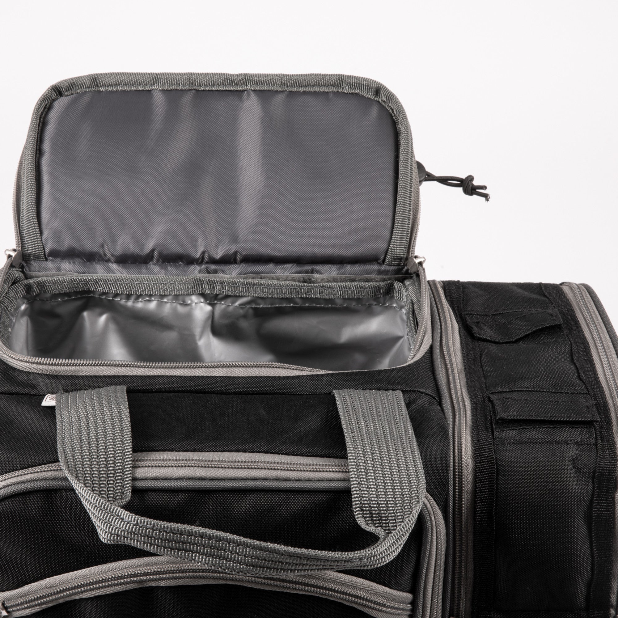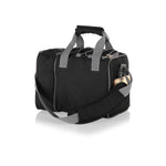 - A separate insulated, two-bottle beverage section has a padded divider and peek-through closures for tall bottles