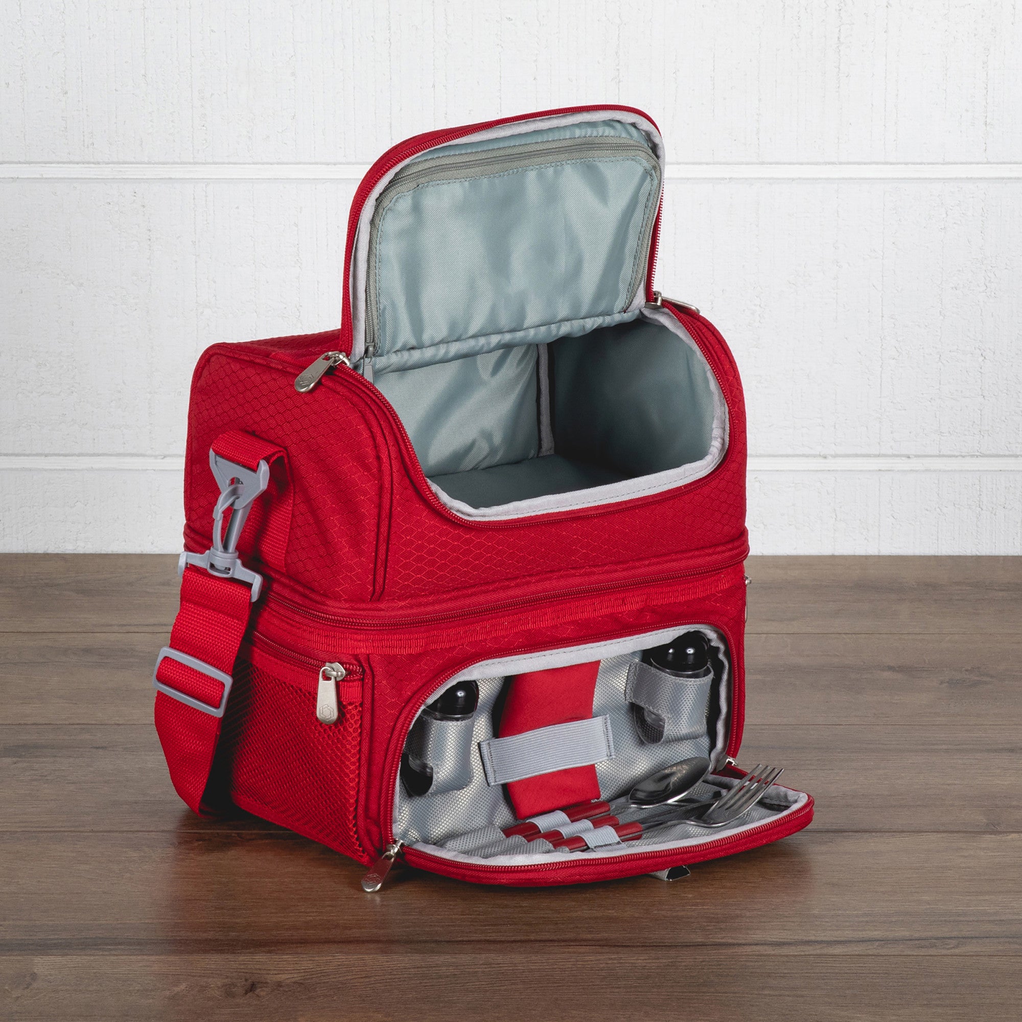 The Oniva Pranzo Lunch Cooler comes with eating utensils and containers for your salt and pepper. The cooler is separated into a thermo lined half for cold items and a upper portion for all other items.