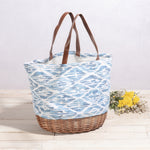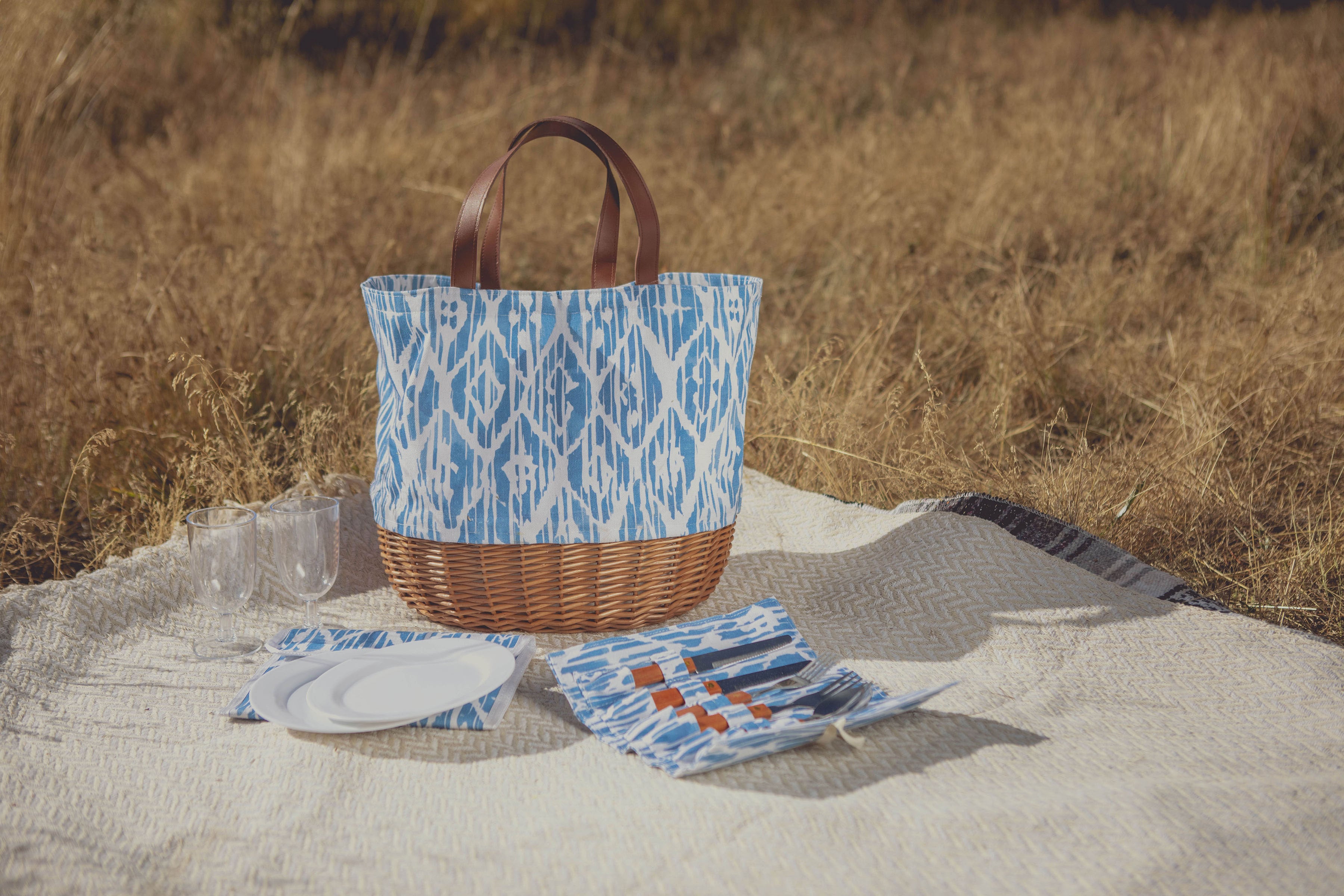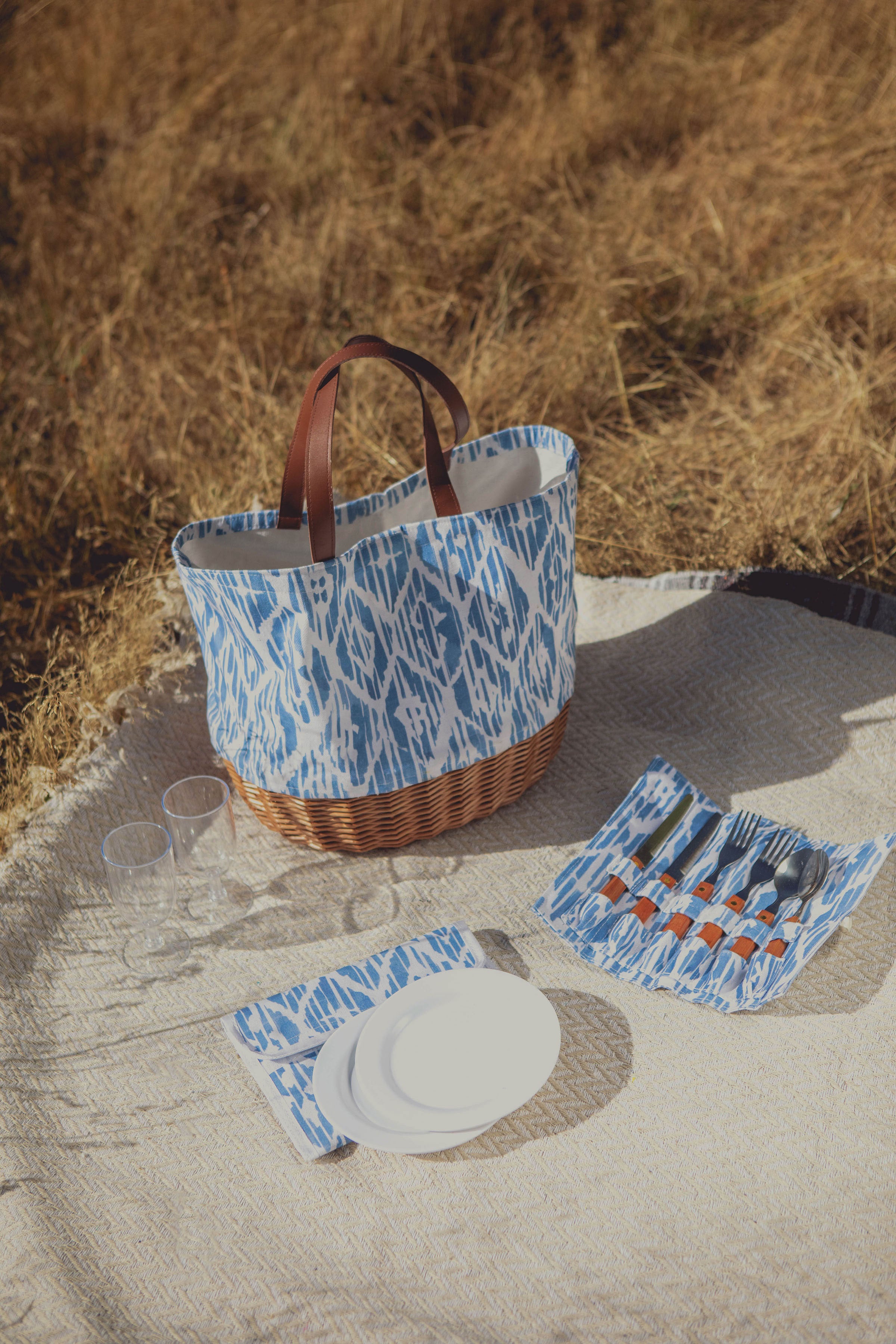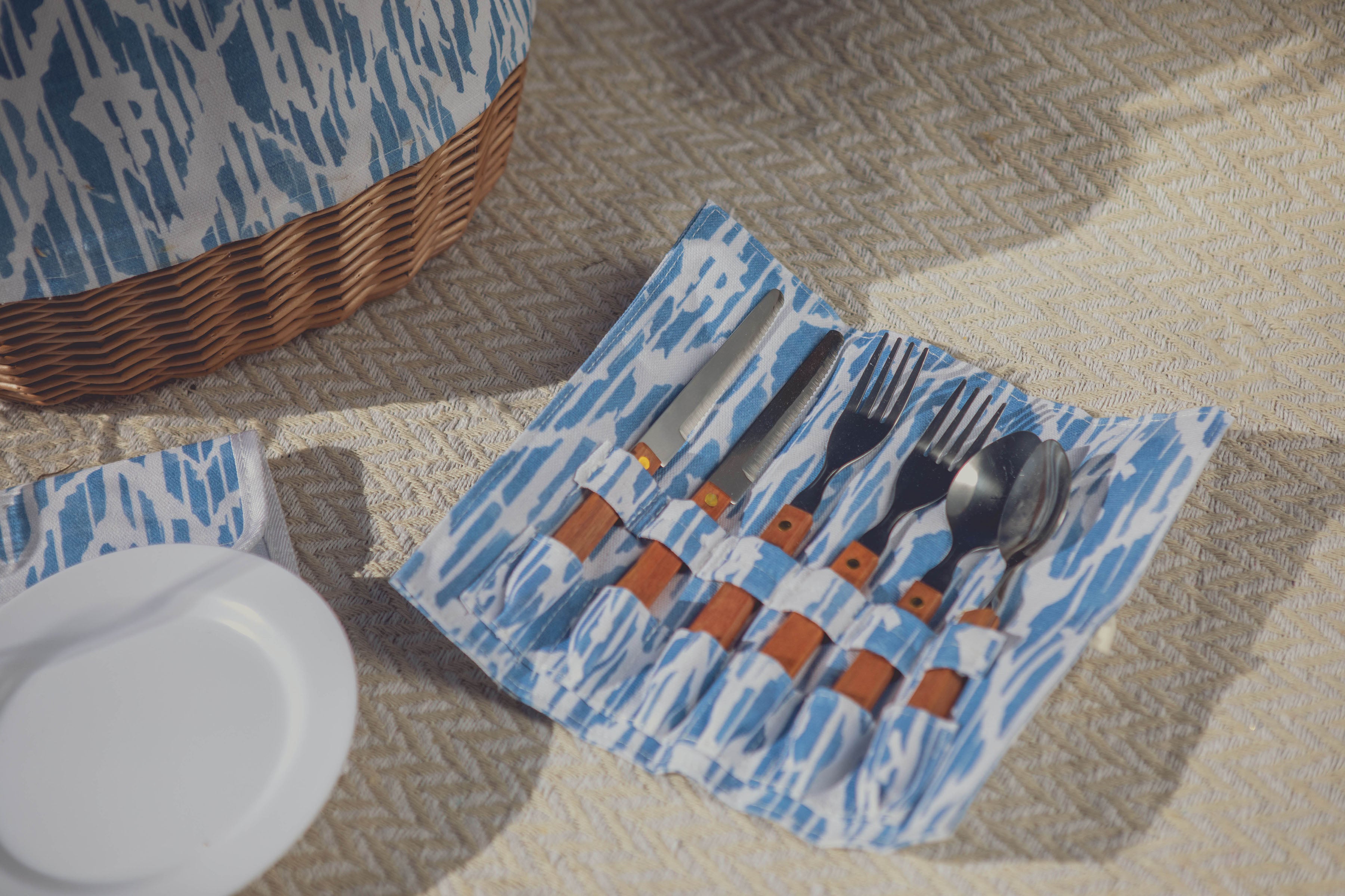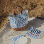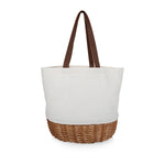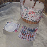 White canvas tote bag with woven willow bottom is so cute. Big enough to bring food and things I need to eat outside. Included pair of hand size plates, utensils and cups are nice. I like roll-up utensil holder.