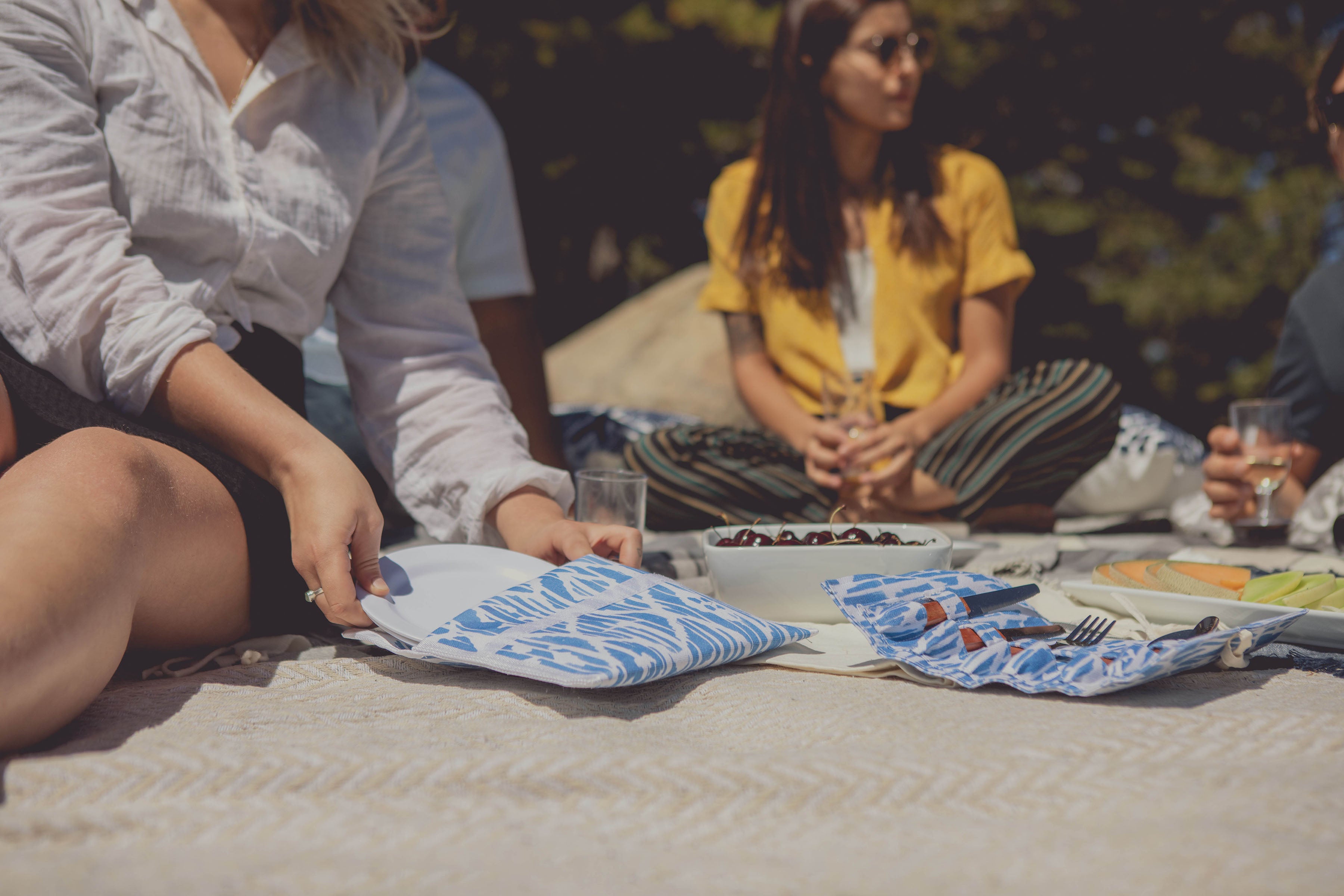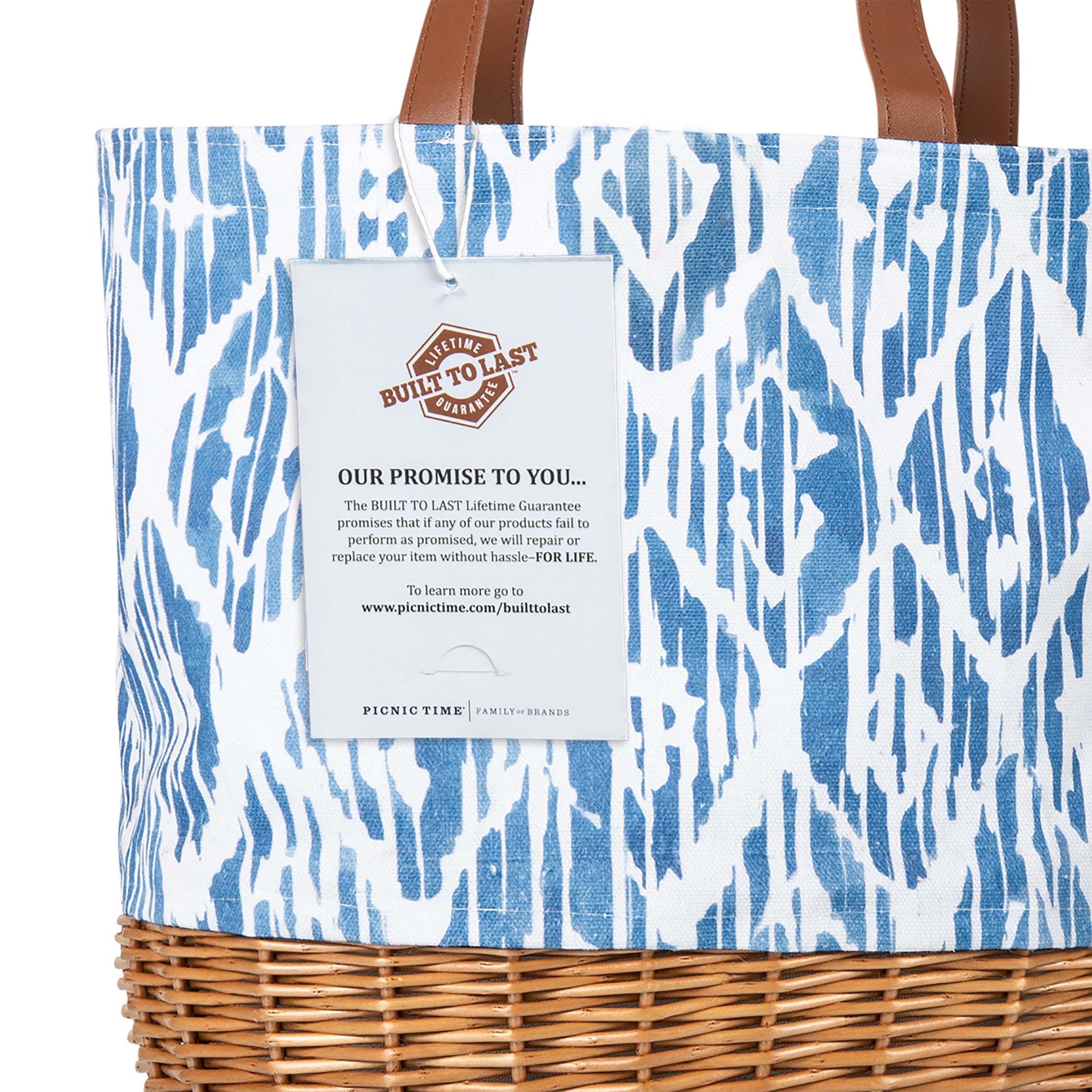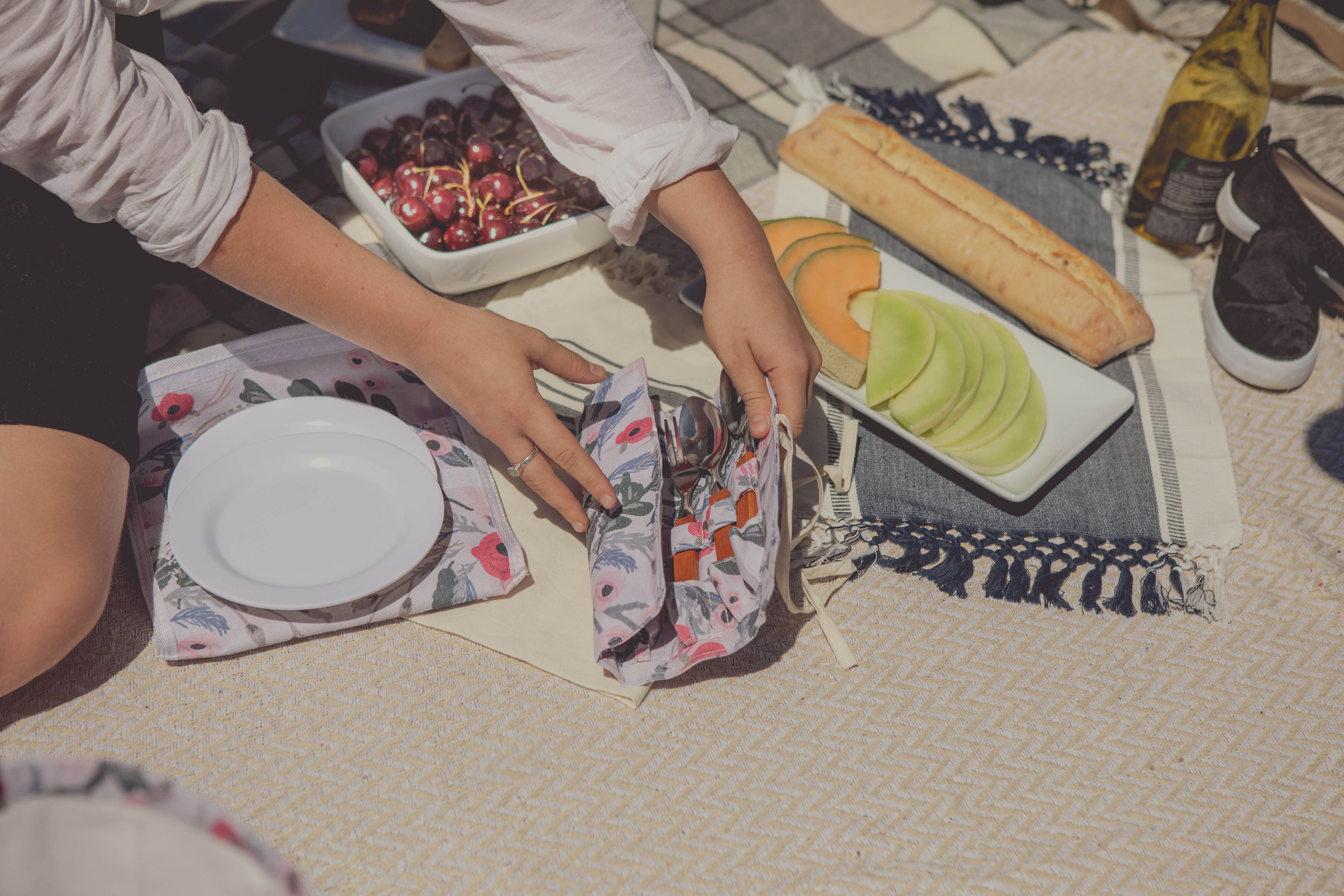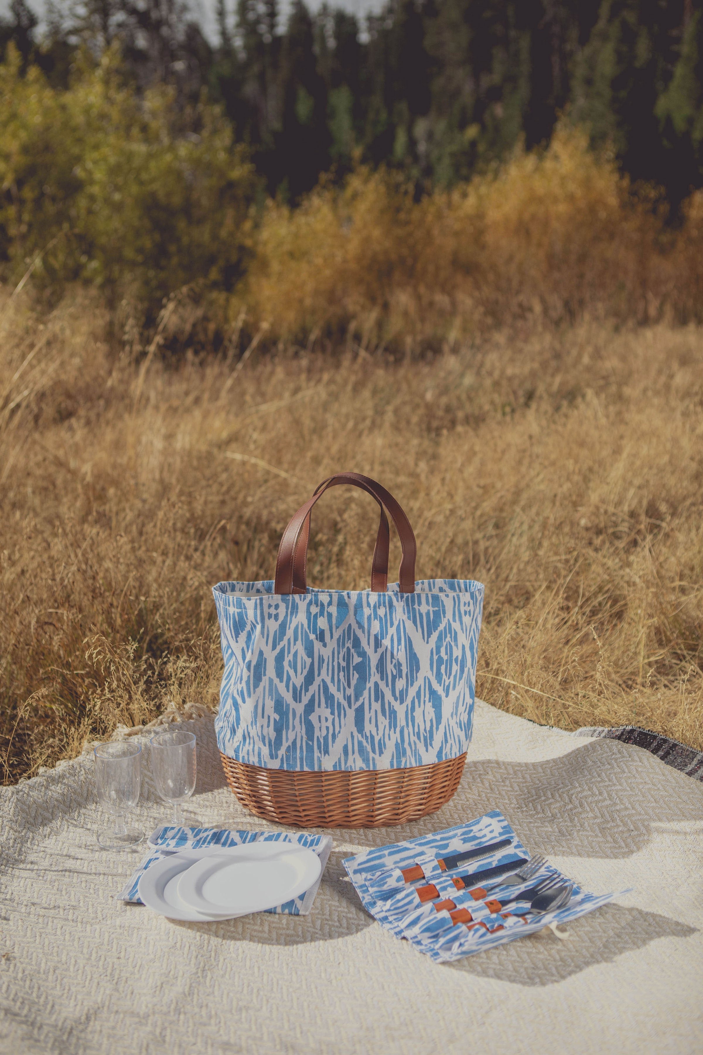 White canvas tote bag with woven willow bottom is so cute. Big enough to bring food and things I need to eat outside. Included pair of hand size plates, utensils and cups are nice. I like roll-up utensil holder.