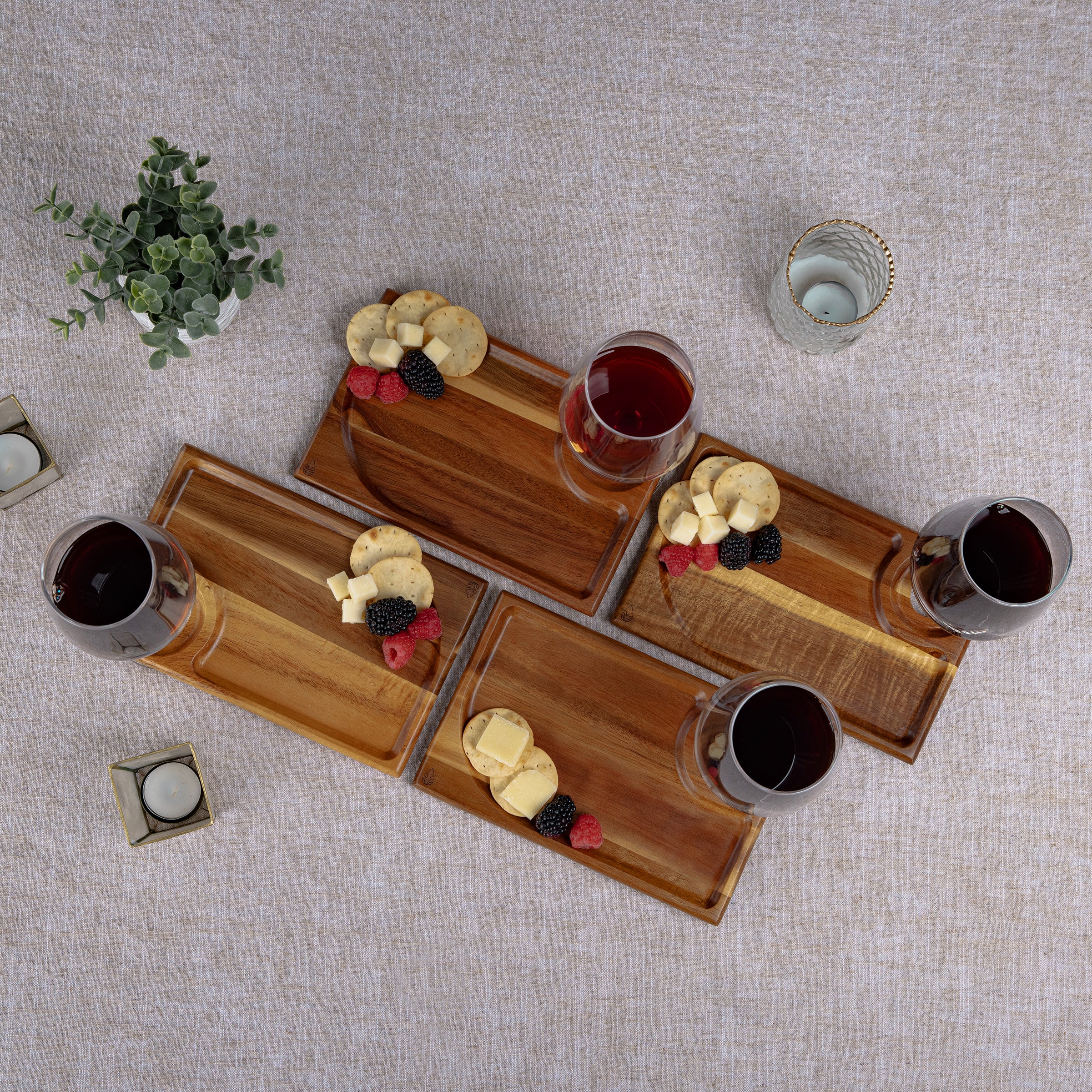 I got this gorgeous set of four cocktail appetizer plates by TOSCANA which is part of the Picnic Time brand and just love them! They are not only beautiful but super efficient too. We love to entertain and these are a great way to set up beautiful individual appetizer plates for our guests or even them to create there own. It has the perfect place to rest your wine or champagne glass to be able to nibble and mingle without the awkward feeling of not knowing where to set your glass down. They will even work with a stemless glass if you choose. The boards are super light too, a plus for moving around! We are loving them so far and got immediate compliments on them! The beautiful acacia wood design shows beautiful grains in the wood, and is an environmentally responsible natural wood which only makes it better. Now I just need a few more of them for a larger group! Toscana by Picnic Time has a variety of beautiful products, and offer built to last pledge which means they will repair or replace your item without hassle for life! Dont forget these will make the BEST gifts too!
