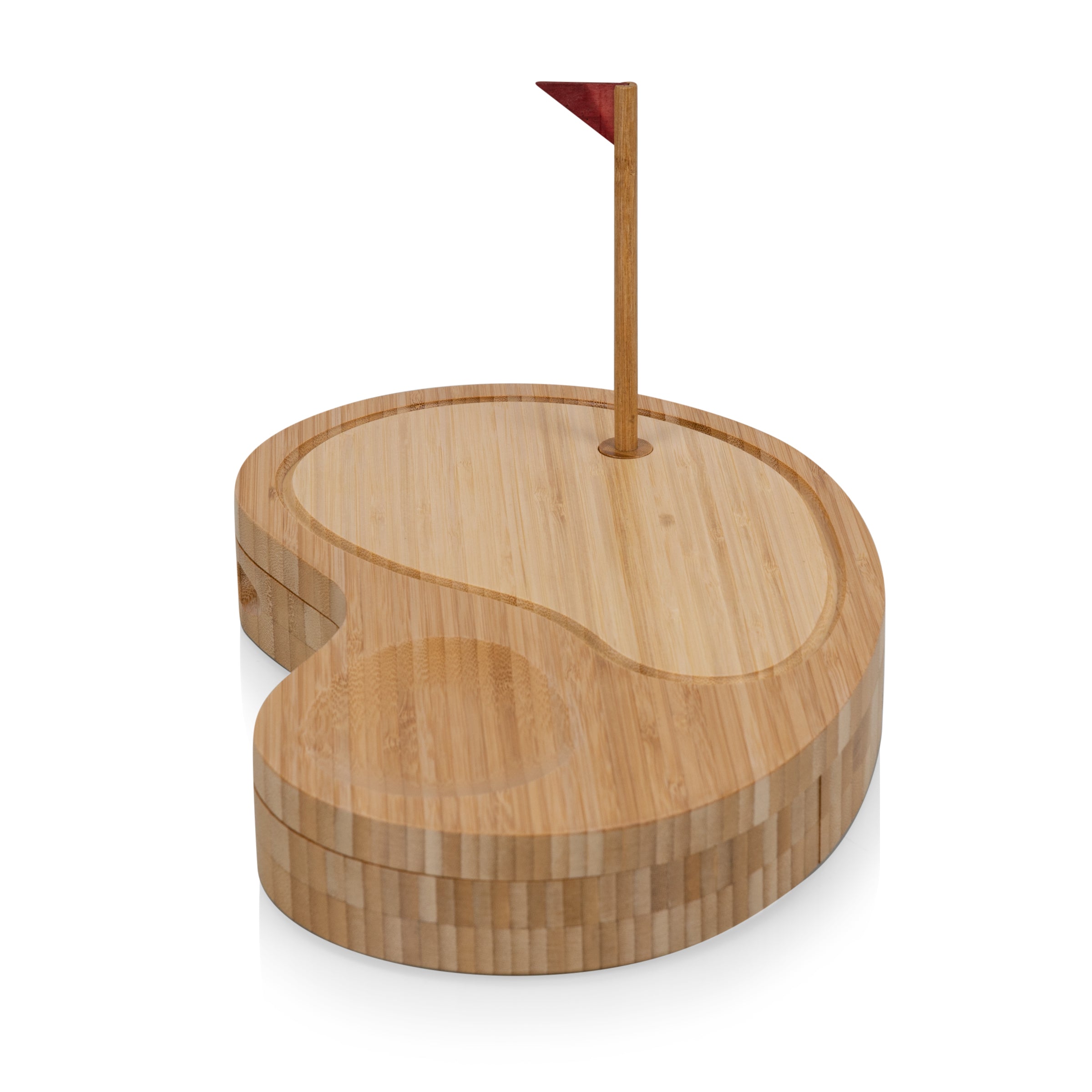 Perfect for the "19th Hole," the Sand Trap Cheese Board is a unique, golf-inspired cheese cutting board set made from rich bamboo and featuring two hidden swing-out drawers containing six stainless steel wine & cheese tools.