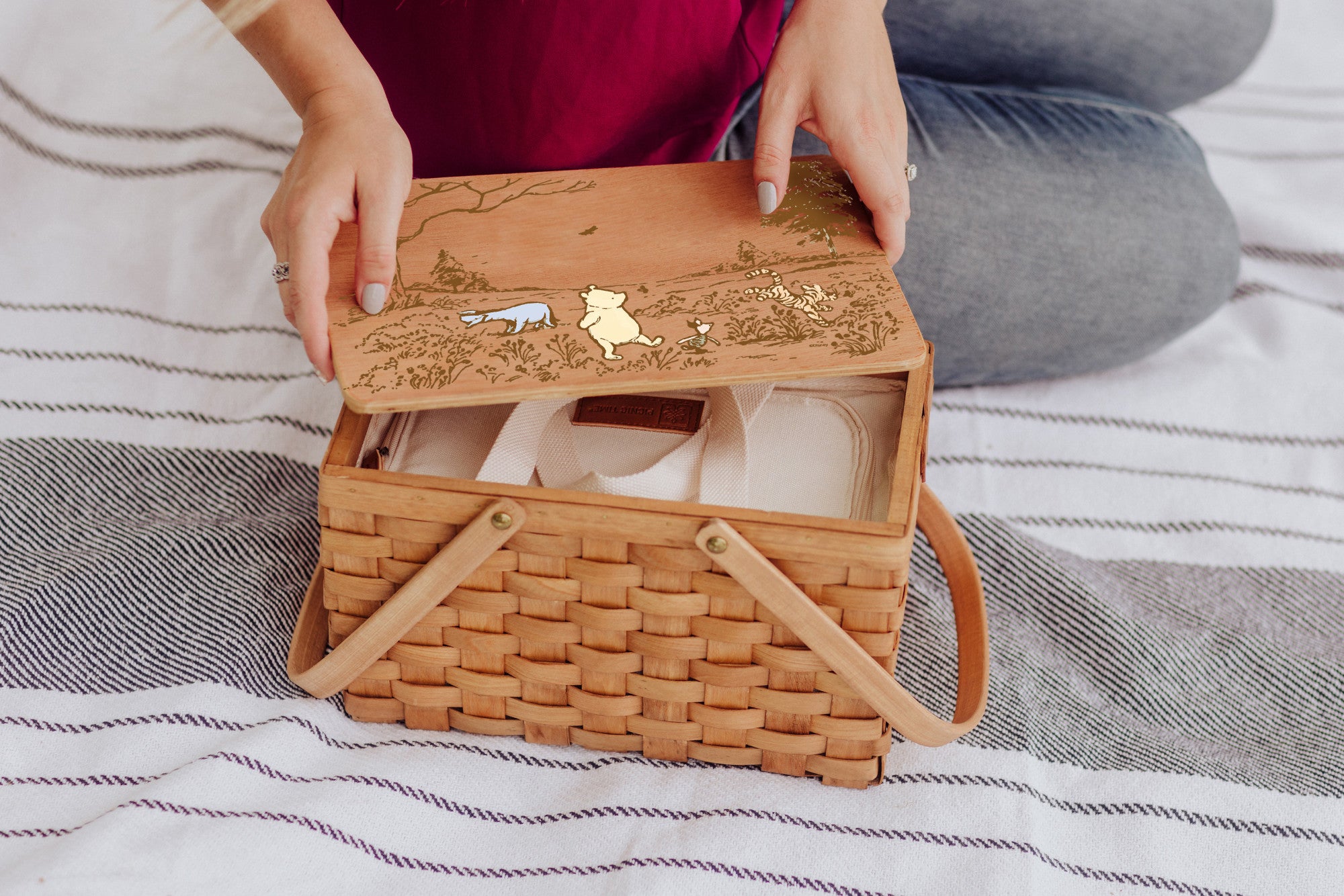 The Winnie the Pooh Poppy Personal Picnic Basket is a handwoven wicker basket ideal for bringing a little vintage Disney charm to your office lunch or for toting wine and snacks to an outdoor concert.